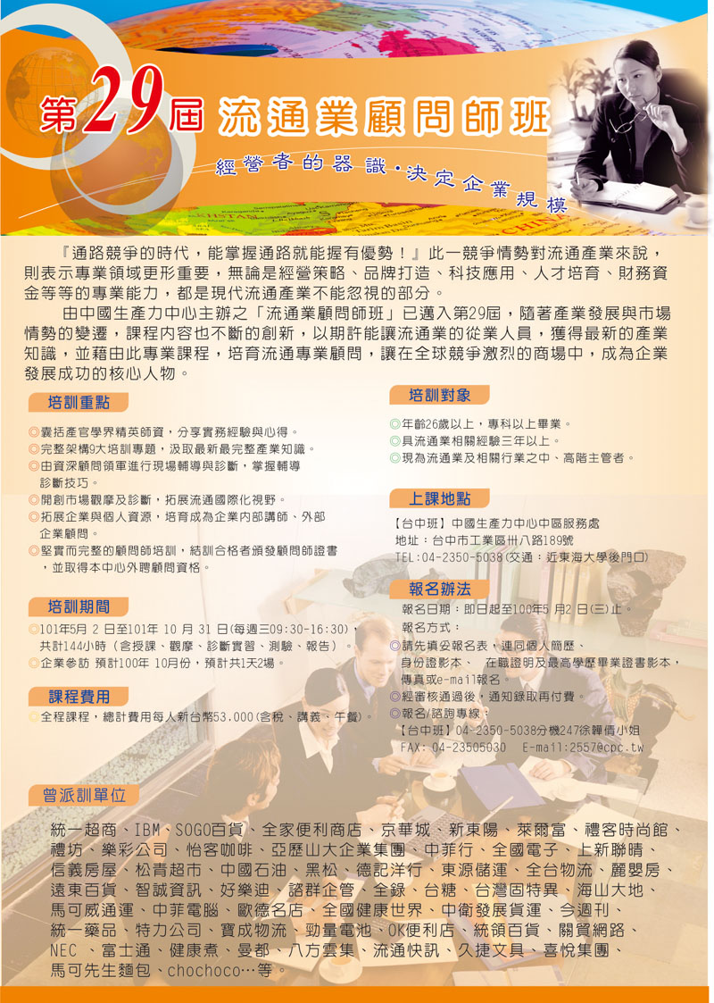 第29屆流通業顧問師班 | 101 年5 / 2 ~10 / 31 (週三) | 09:30~16:30 |